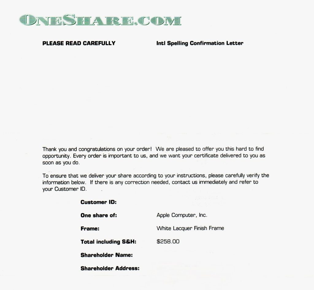 Apple Inc.の1株 27,000円くらいで購入しました。確か額縁の種類も選択できたと記憶します。
